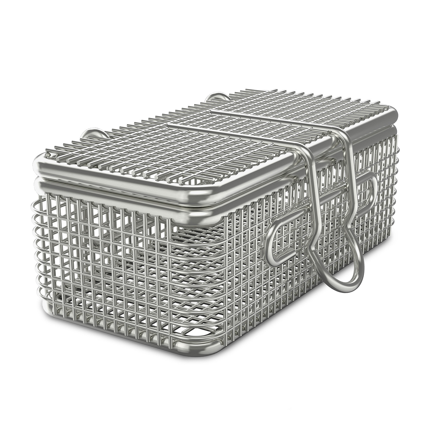 Rinsing basket with fixed lid, made of high-quality stainless steel wire for storing small parts and accessories during the cleaning process.